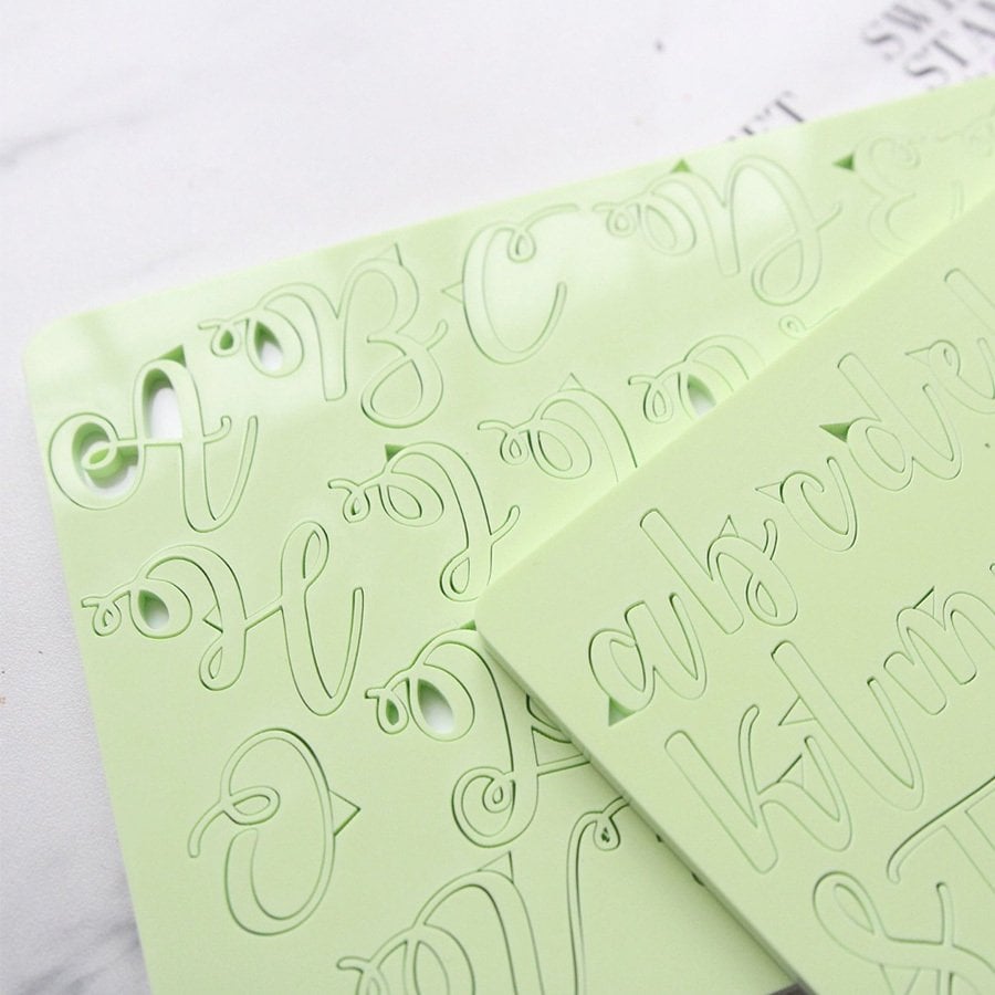 Sweet Stamp Curly alfabe seti ince, narin baskı sonucu vermesi nedeniyle en gelişmiş Sweet Stamp setidir. Boyama sırasındaki el hassasiyeti önemlidir.